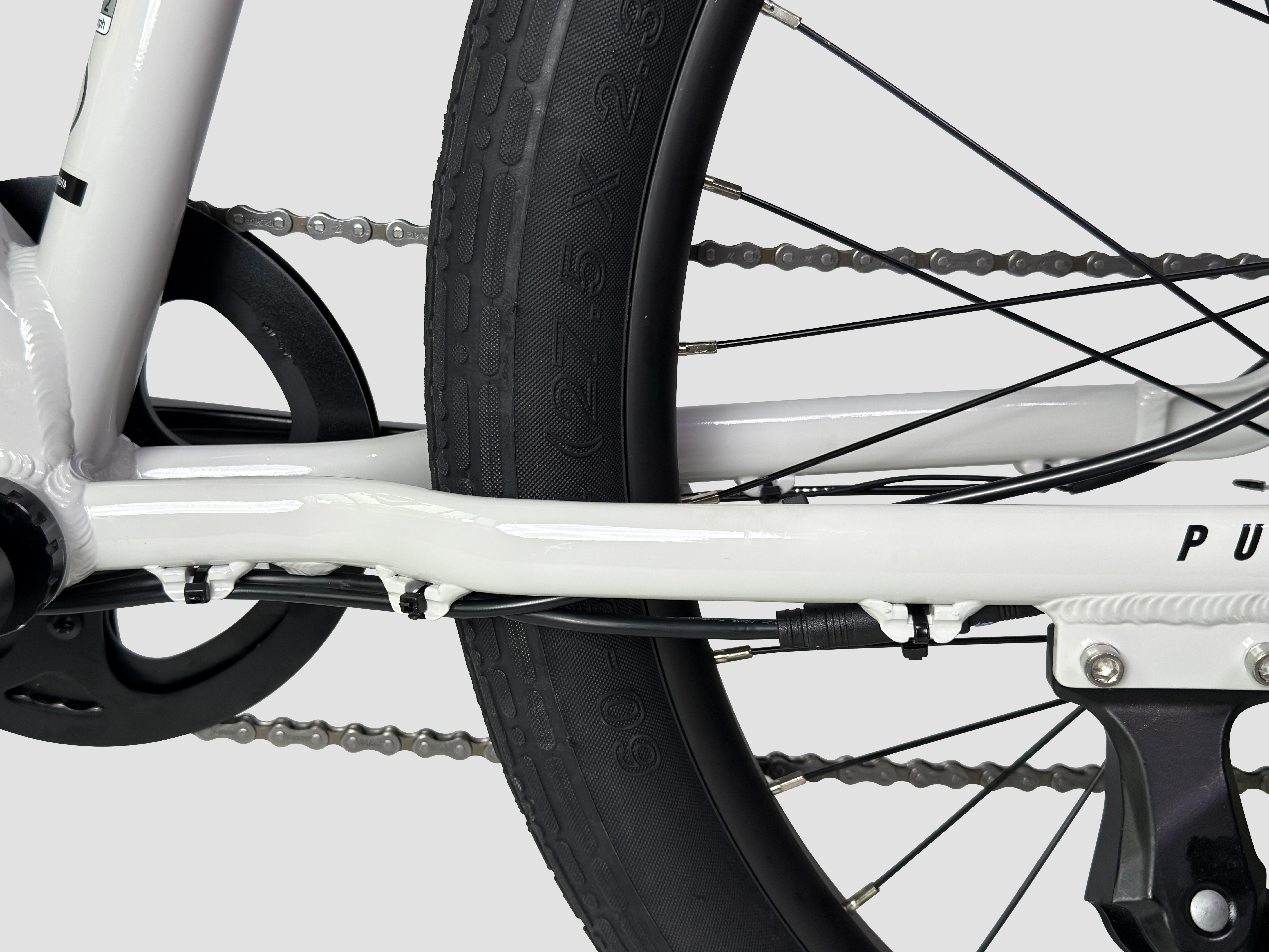 - Route the rear light cable along the underside of the drive-side chainstay, following the integrated derailleur cable guides. Cut the existing four zip ties and secure the cable with new ones.