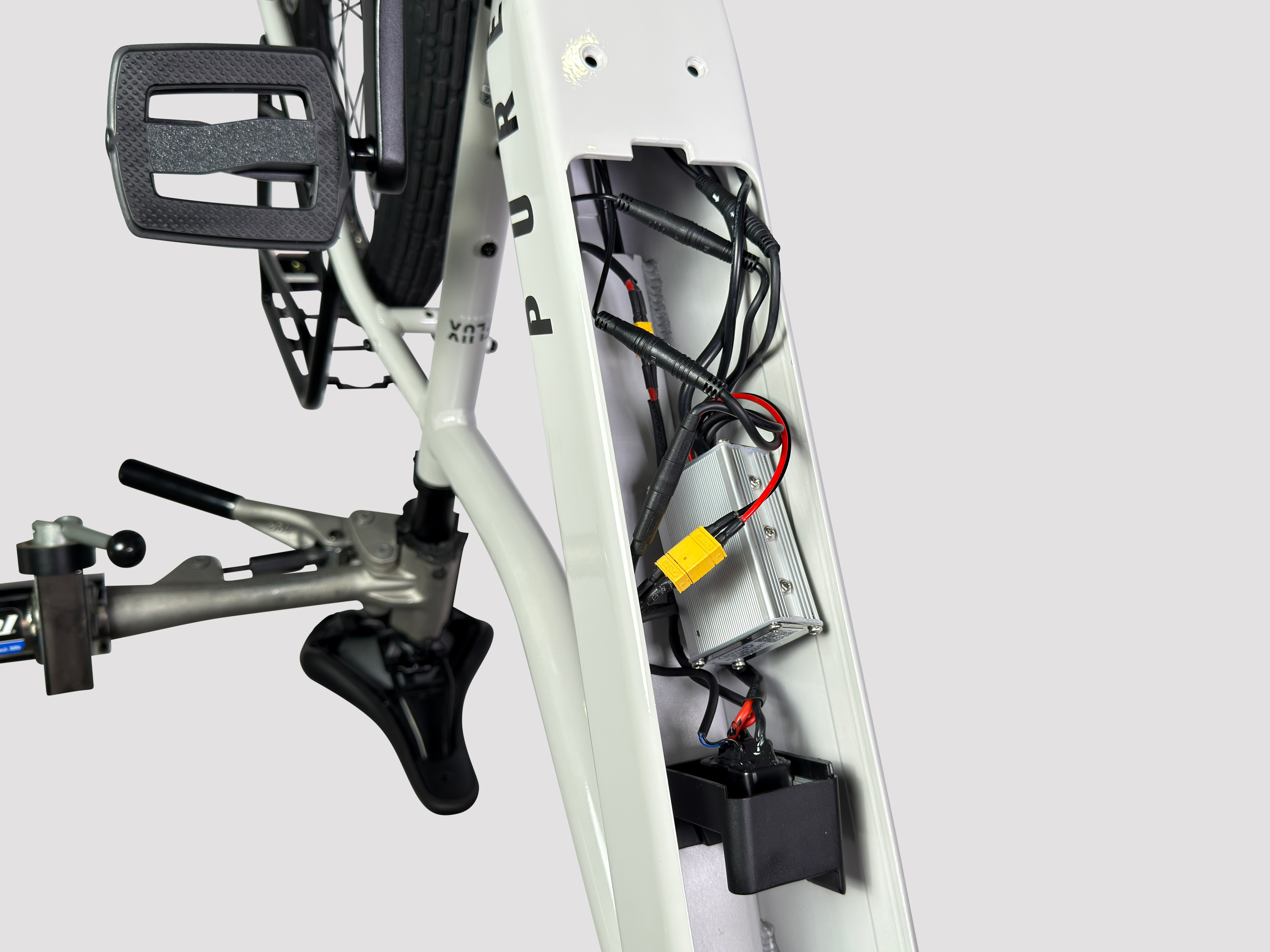 - Using a T25 Torx wrench, remove both bolts securing the lower battery mount. Carefully slide the mount partially out of the frame, being mindful not to damage or disconnect any cables.